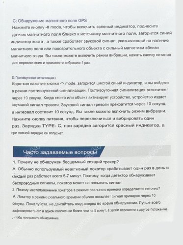 Противоугонная сигнализация. Коротко нажать на кнопку выбора режимов работы. Внизу на дисплее мигает синий индикатор. При изменении место положения анти жучок в течении 10 сек издает громкий звуковой сигнал, мигают ИК светодиоды. Для того, чтобы выключить сигнализацию необходимо коротко нажать на кнопку питания. Комплект поставки: Рабочий блок – антижучок Сыщик 32, кабель для зарядки АБ, инструкция пользователя.